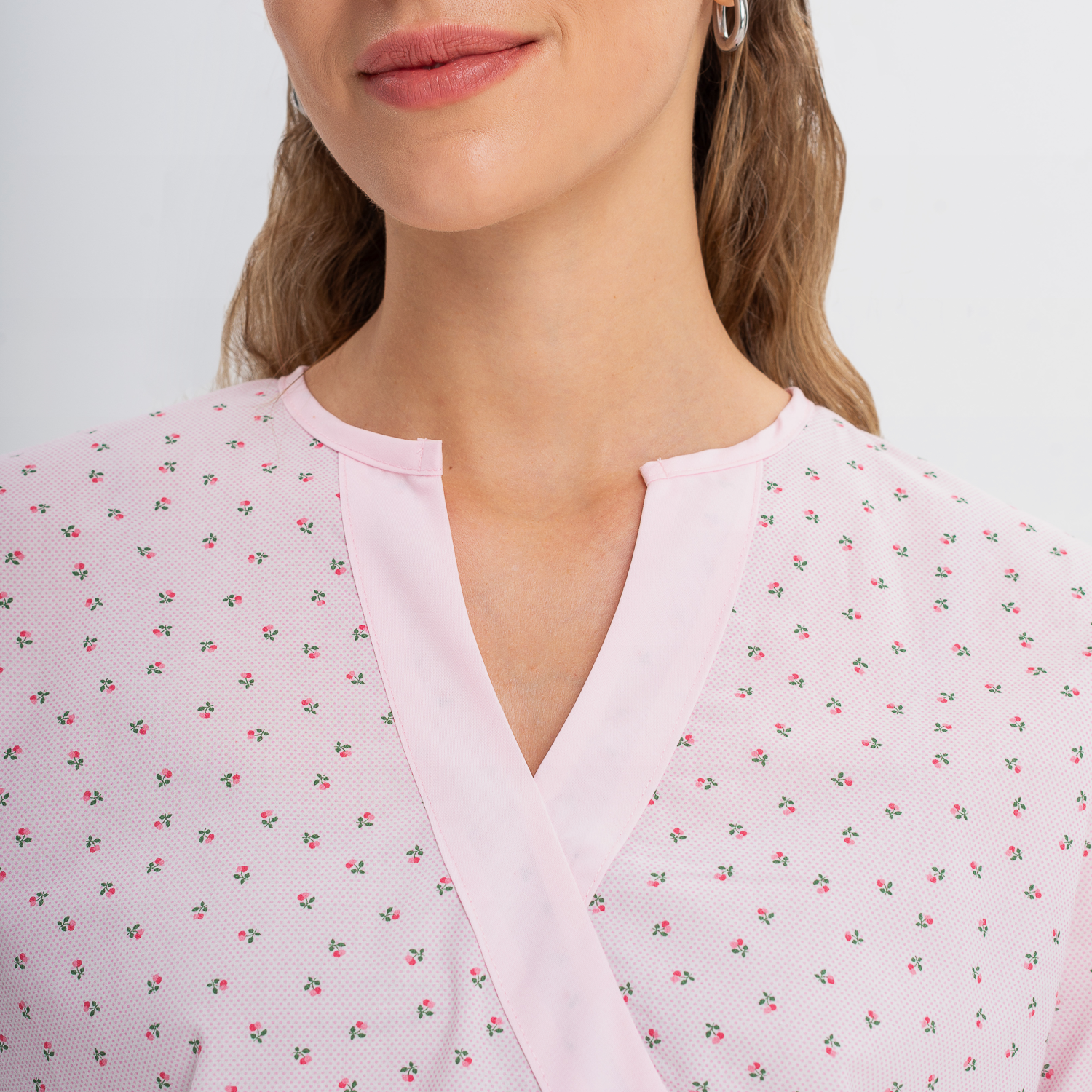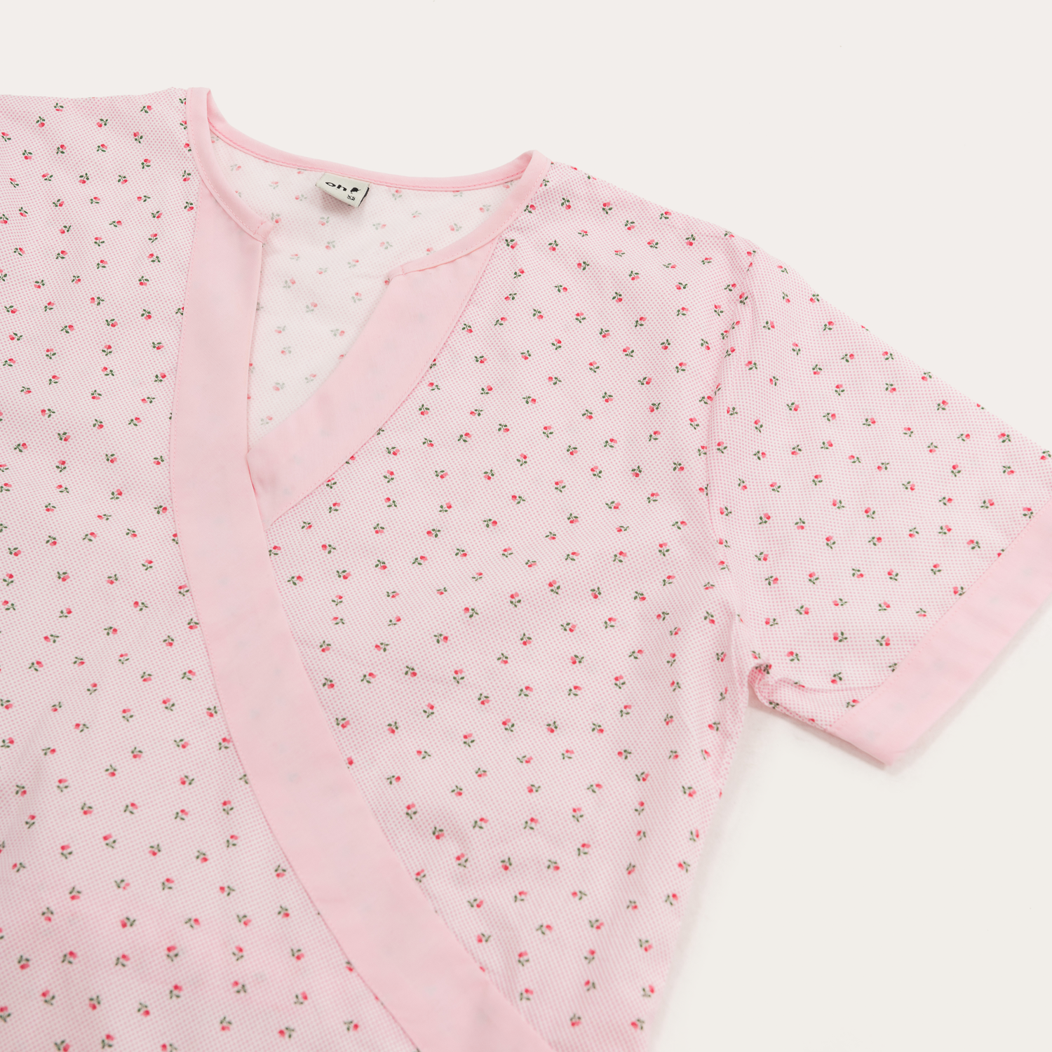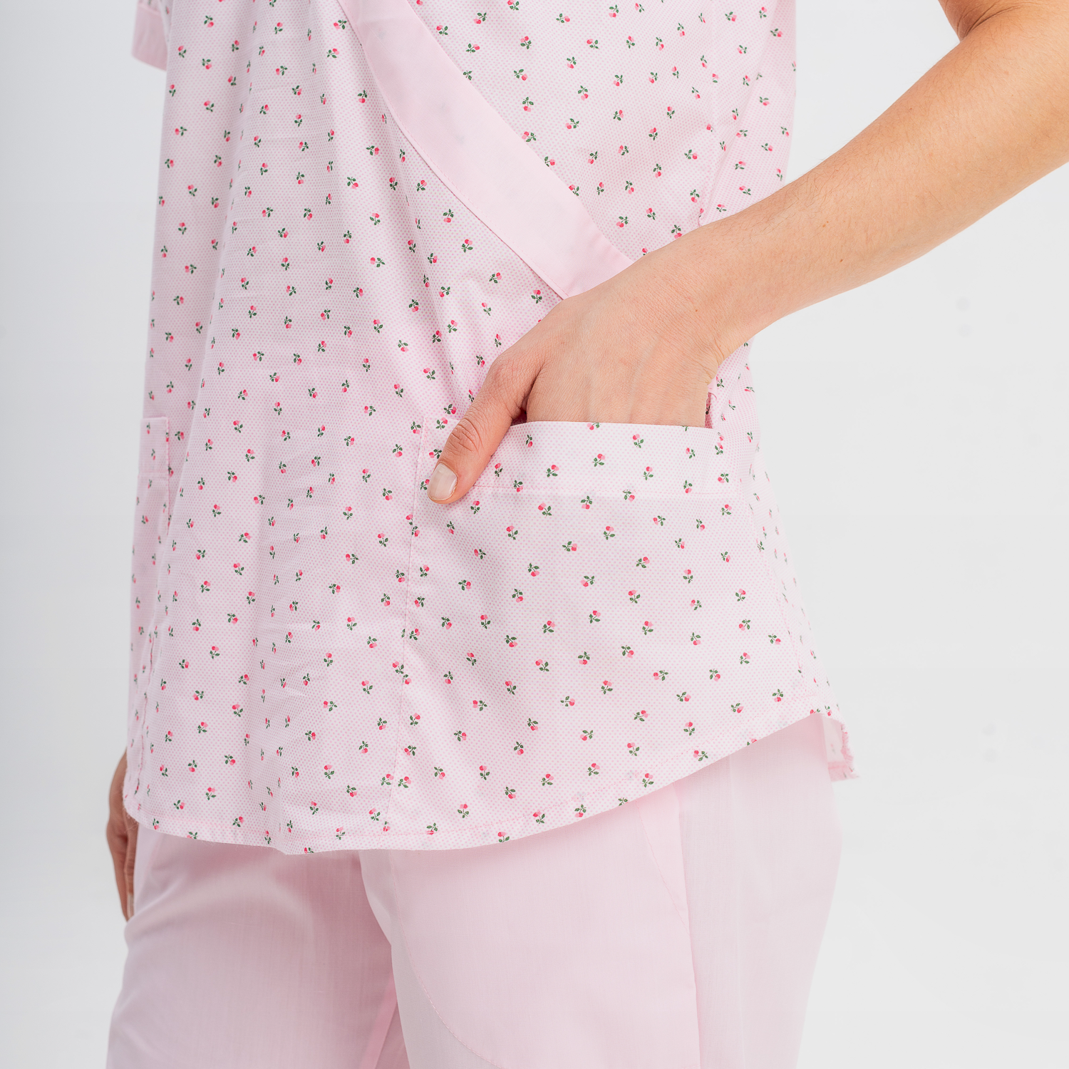 Chaqueta estampada de color predominate rosa con vivos rosa liso.