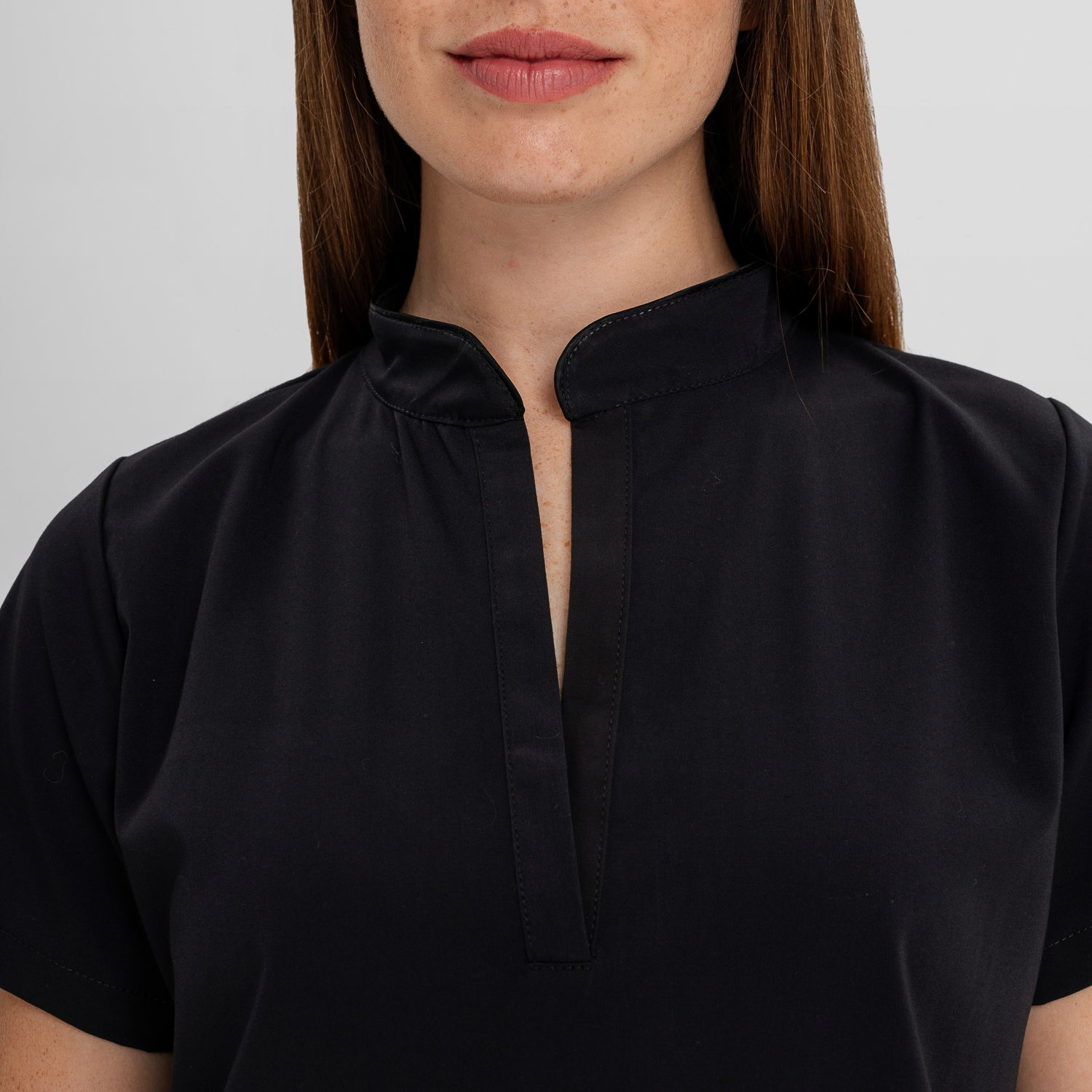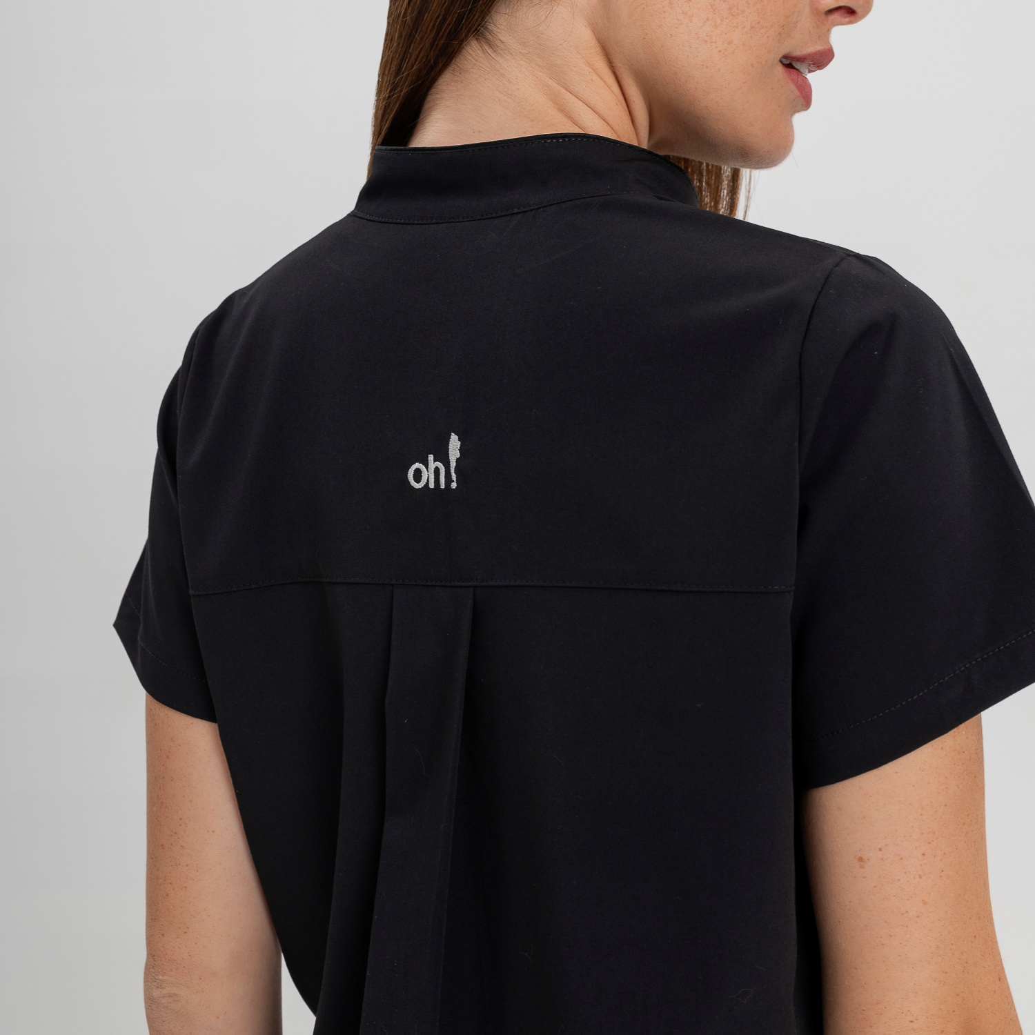 Chaqueta con mangas cortas, cuello mao con abertura en escote sin botones. Bolsillos laterales, espalda con canesú y tabla en el centro.