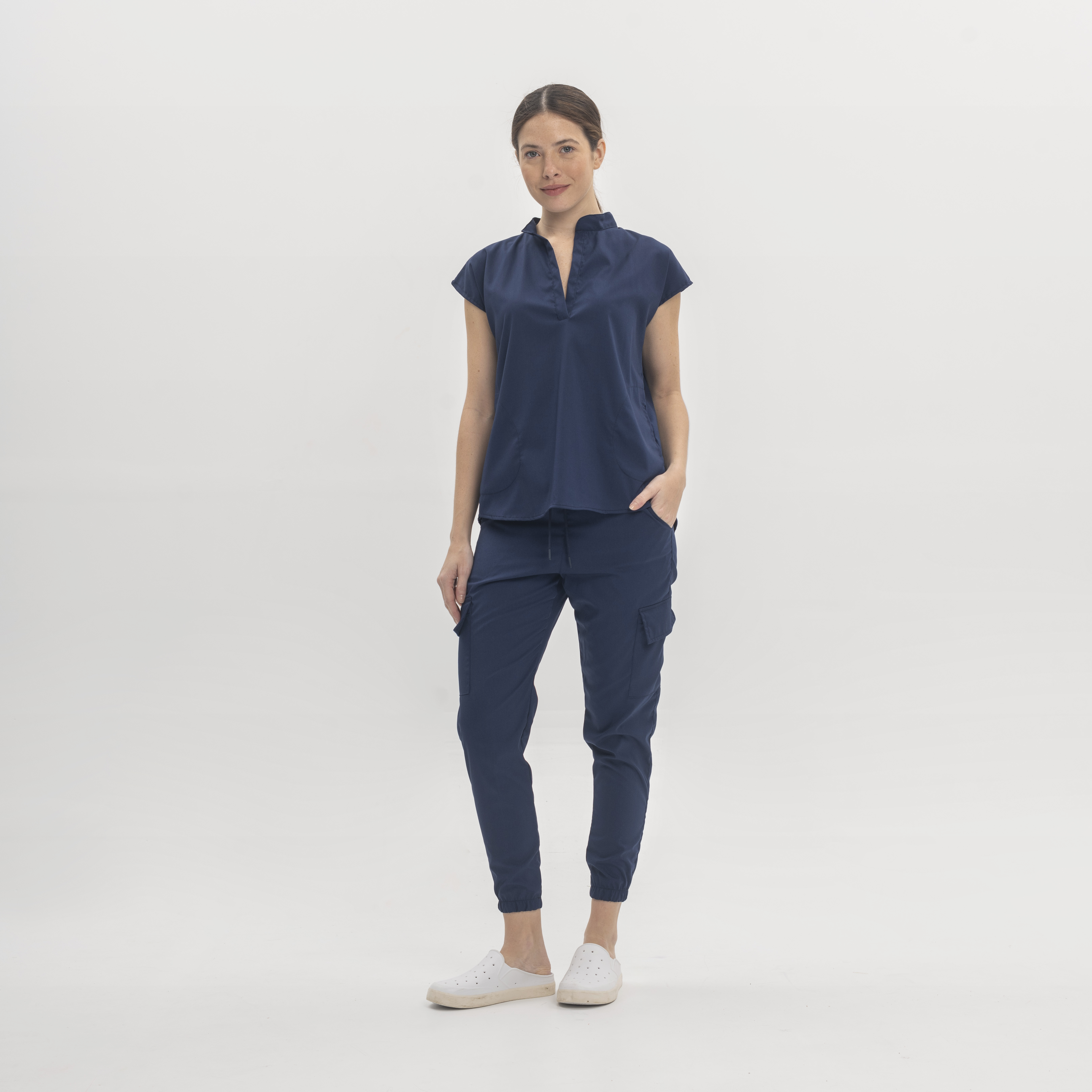 Pantalón estilo jogger chupín. Dos bolsillos laterales, uno en espalda y dos tipo cargo con tapa. Cintura con elástico y cordón de ajuste al tono.