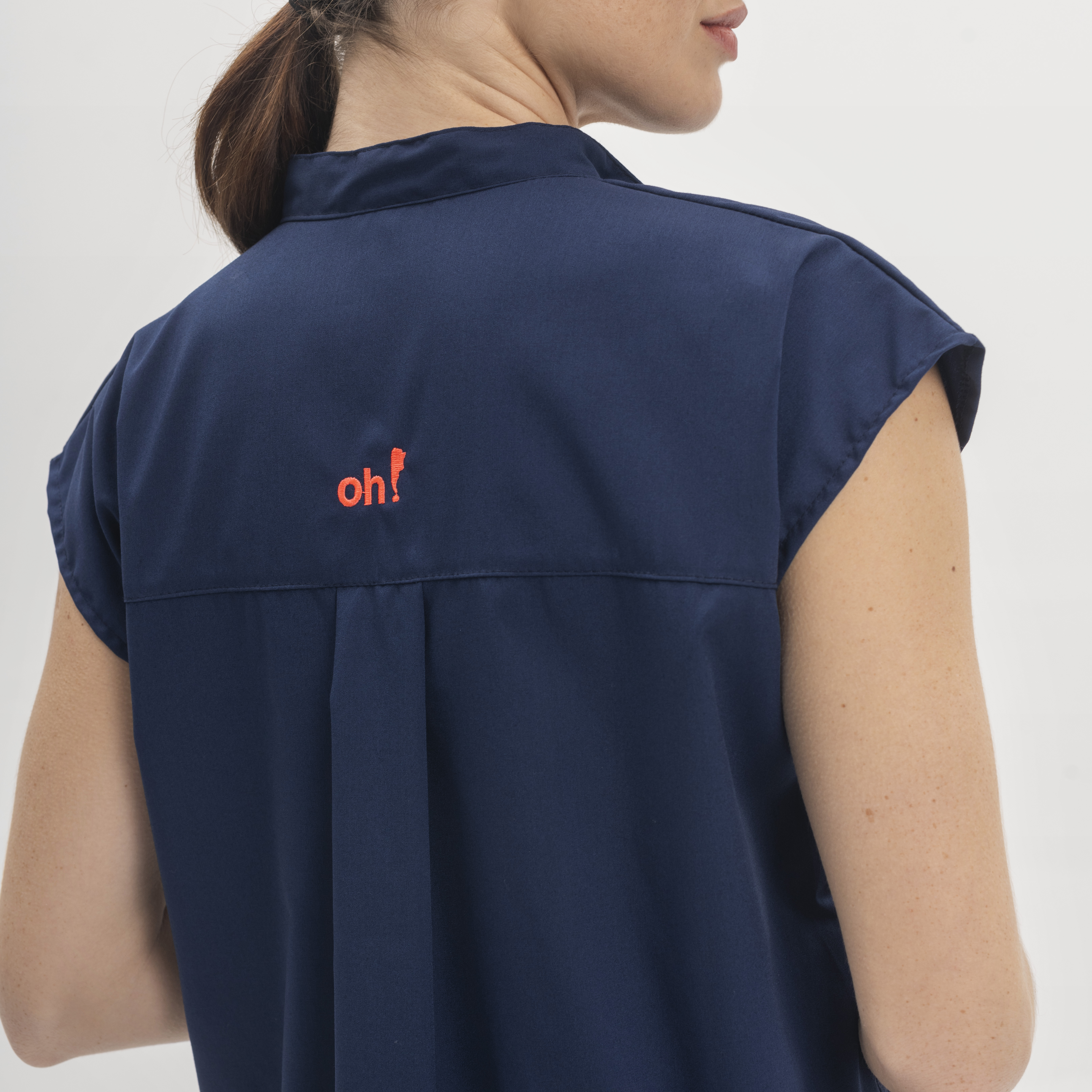 Chaqueta sin mangas, cuello mao con abertura en escote sin botones. Bolsillos laterales, espalda con canesú y tabla en el centro.