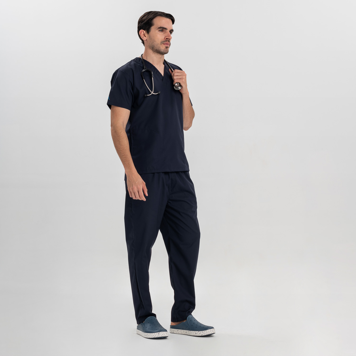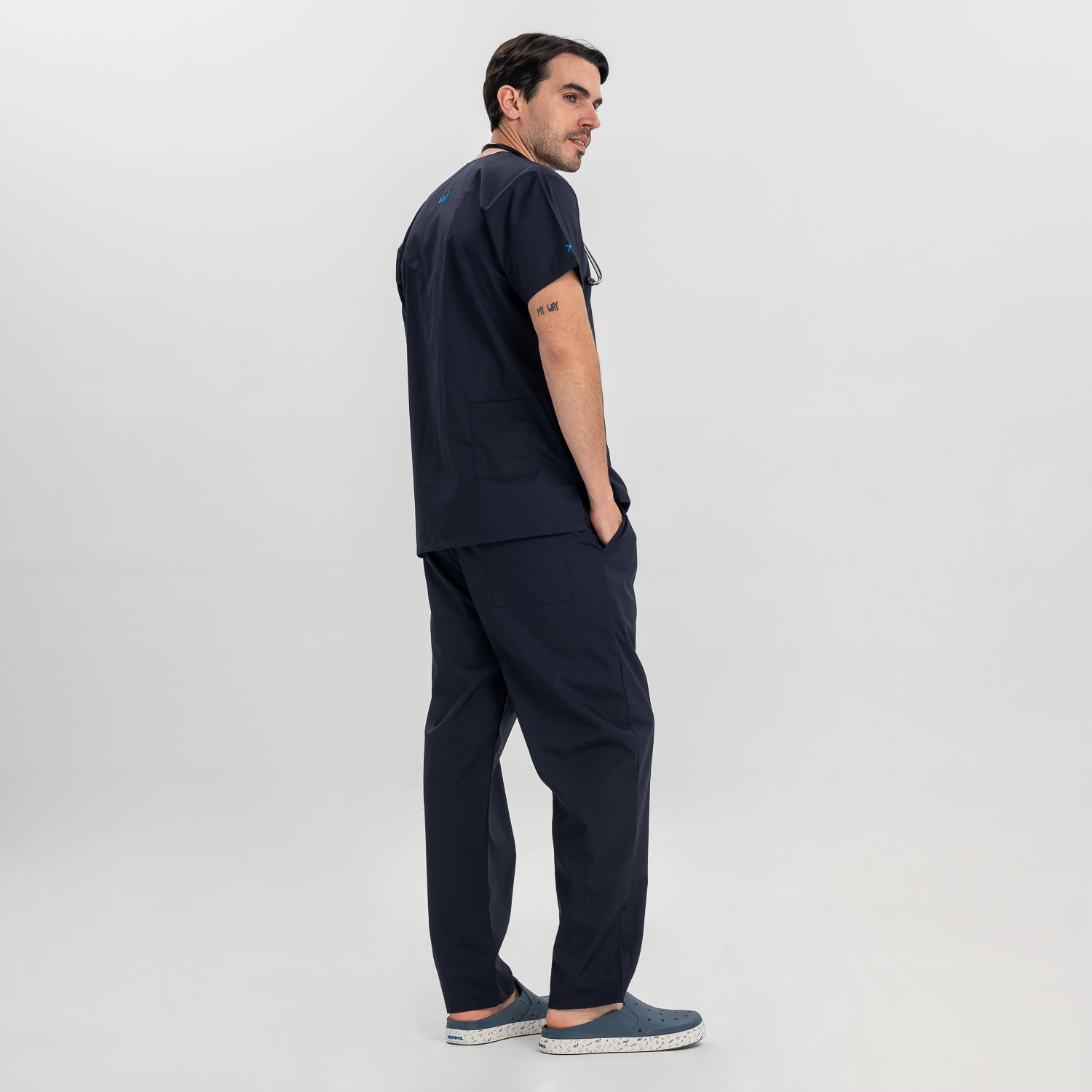 Pantalón de corte recto con cintura elastizada, tira de ajuste y bolsillos laterales.