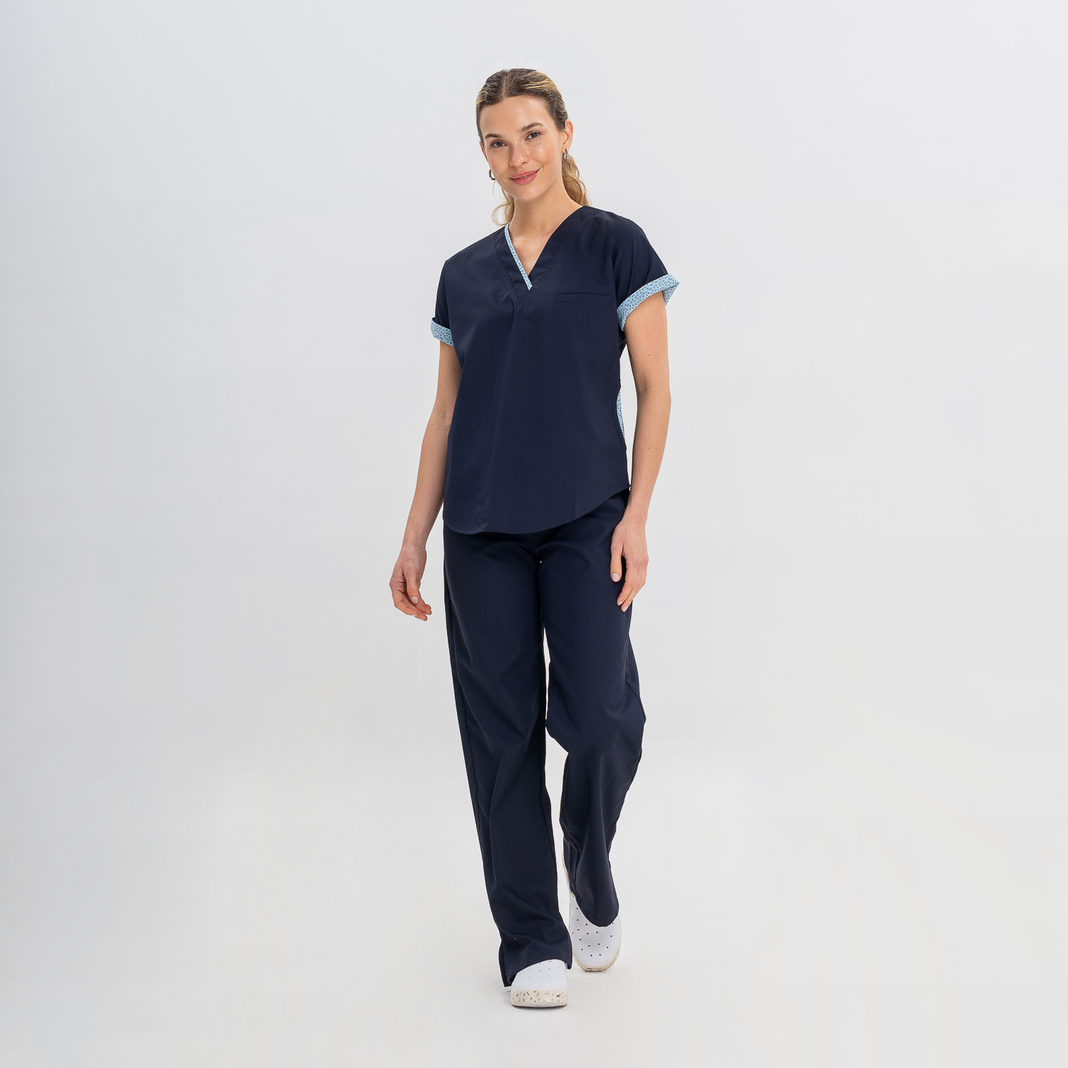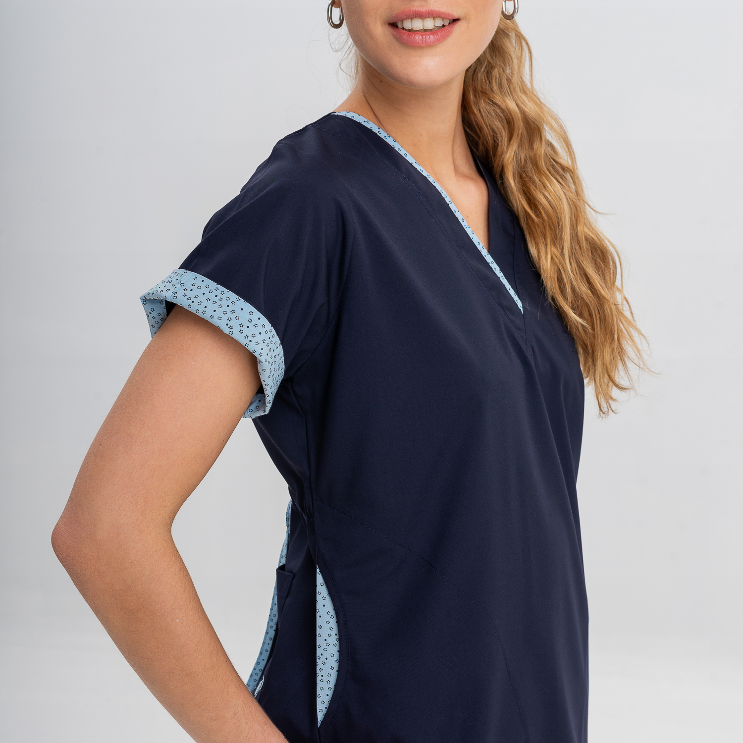 Chaqueta color azul oscuro con vivos estamados de color predominante celeste.