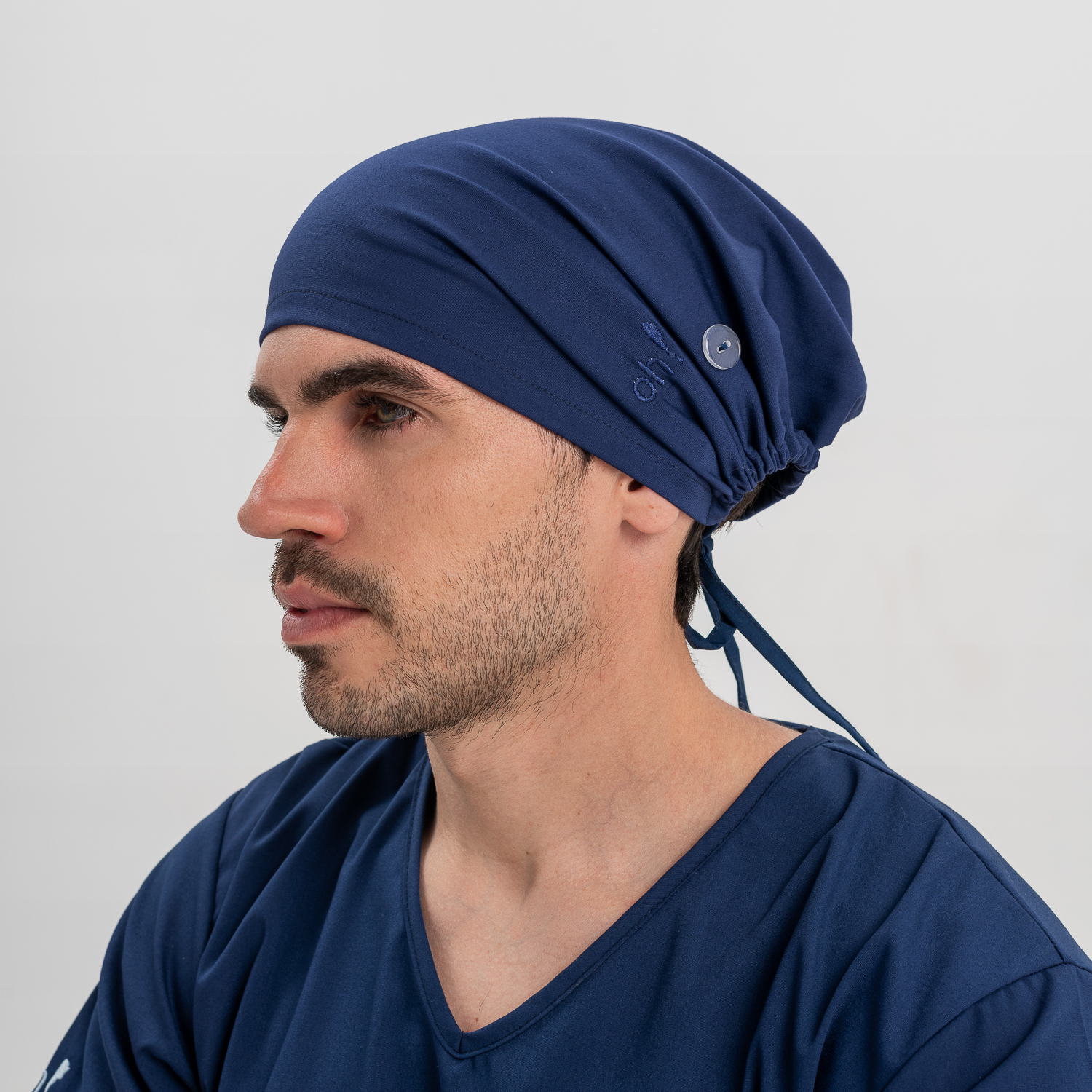 Cofia con jareta ajustable. Botón en lateral para colocar barbijo.