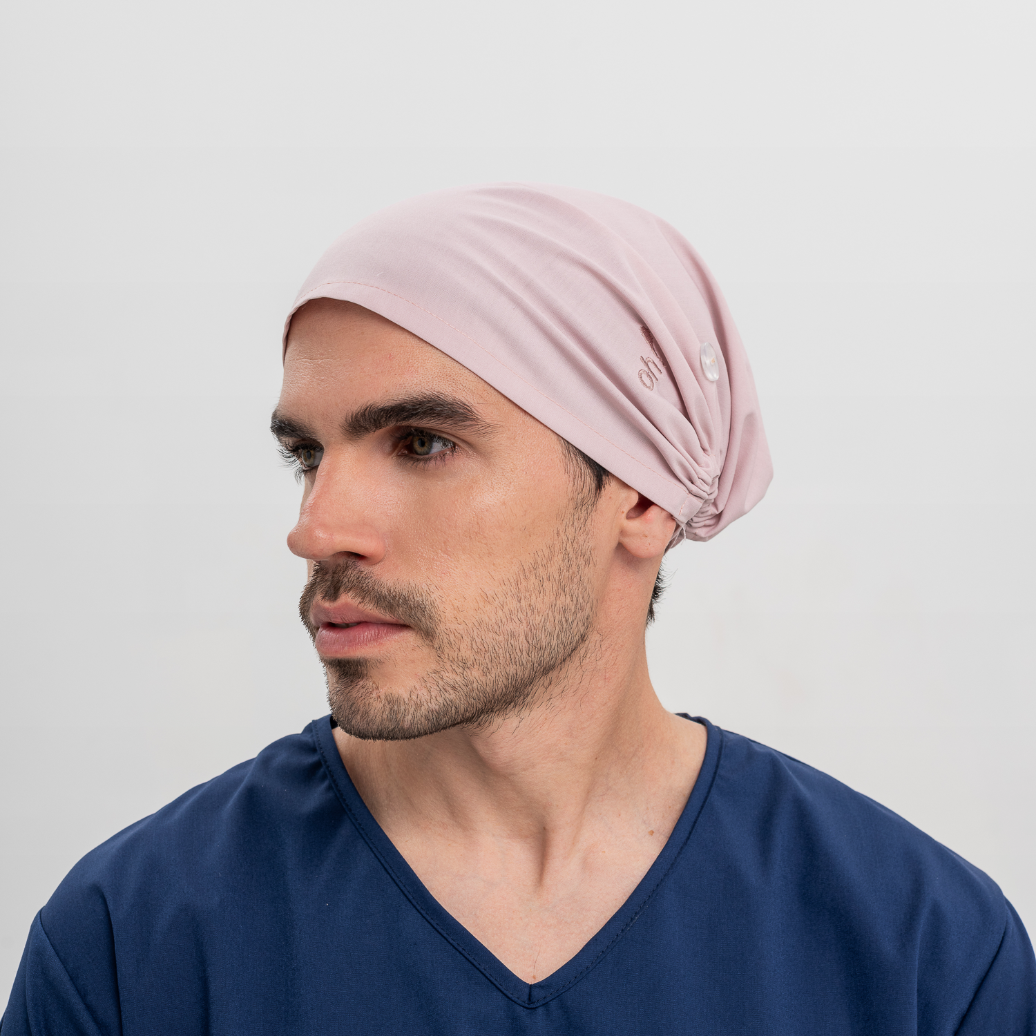 Cofia con jareta ajustable. Botón en lateral para colocar barbijo.