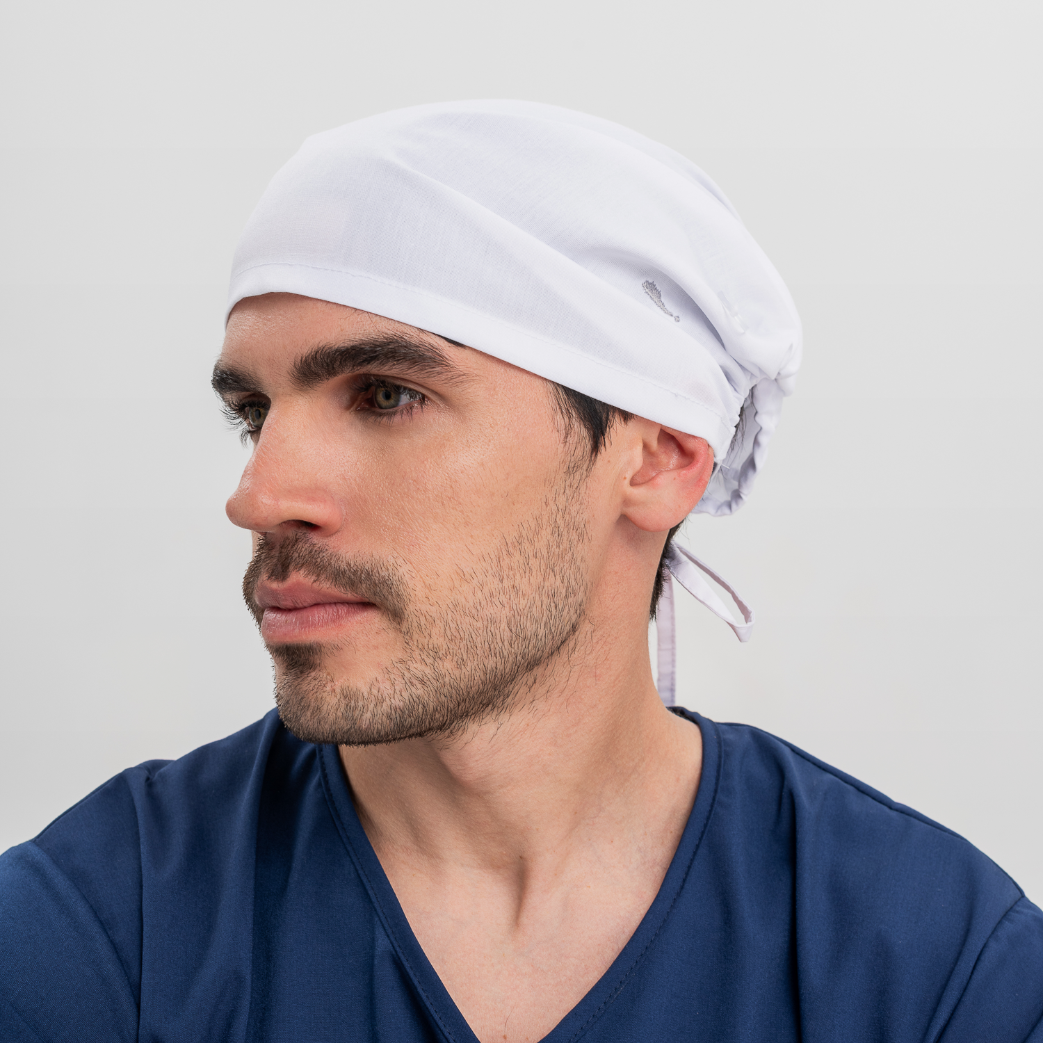 Cofia con jareta ajustable. Botón en lateral para colocar barbijo.