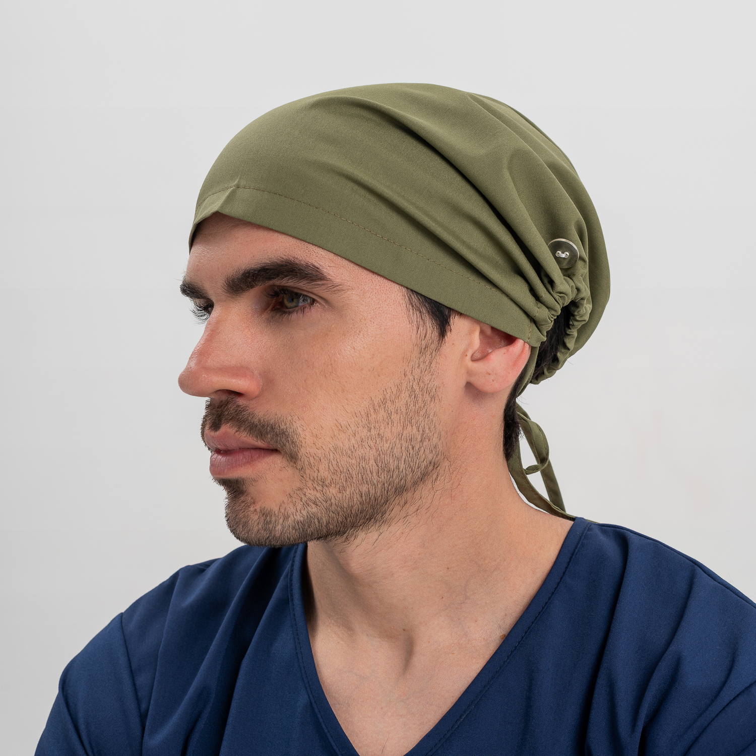 Cofia con jareta ajustable. Botón en lateral para colocar barbijo.