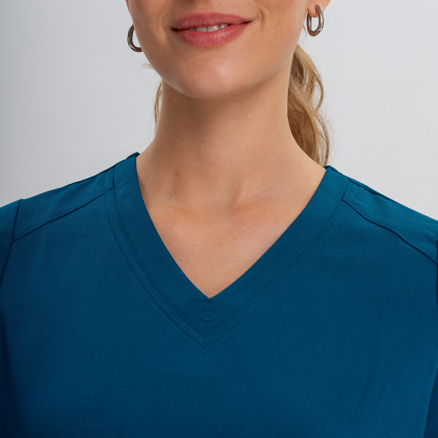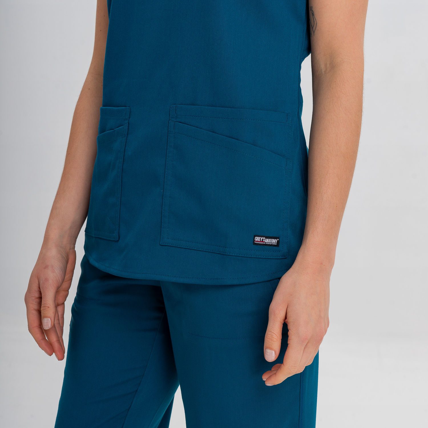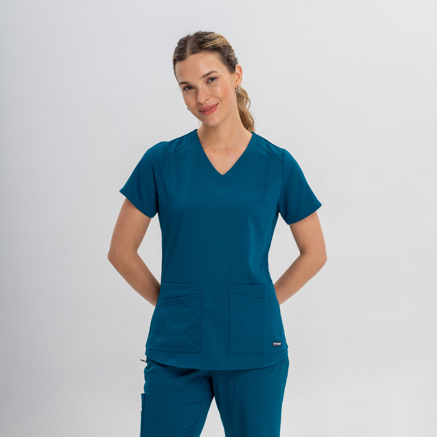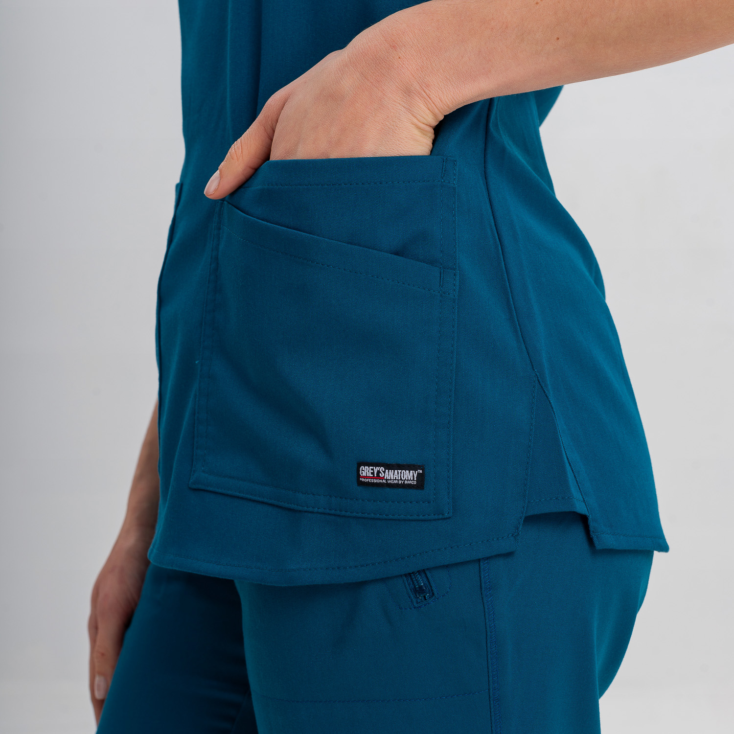 La chaqueta Emma de la colección Evolve de Grey’s Anatomy™ by Barco tiene un calce clásico, escote en V con costuras en ángulo y tajos laterales para mejor movilidad. Cuenta con 4 bolsillos súper prácticos: 2 frontales verticales estilo parche y, sobre cada uno, un bolsillo inclinado extra para que tengas todo a mano.